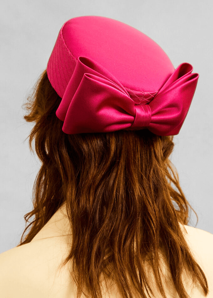 Crafted from luxurious pink silk, this pillbox hat features a sophisticated layer of tone-on-tone tailored veiling around the outer edge, enhancing its refined silhouette.  The sleek, tailored bow at the back adds a playful yet chic detail, making this hat a perfect choice for formal events.