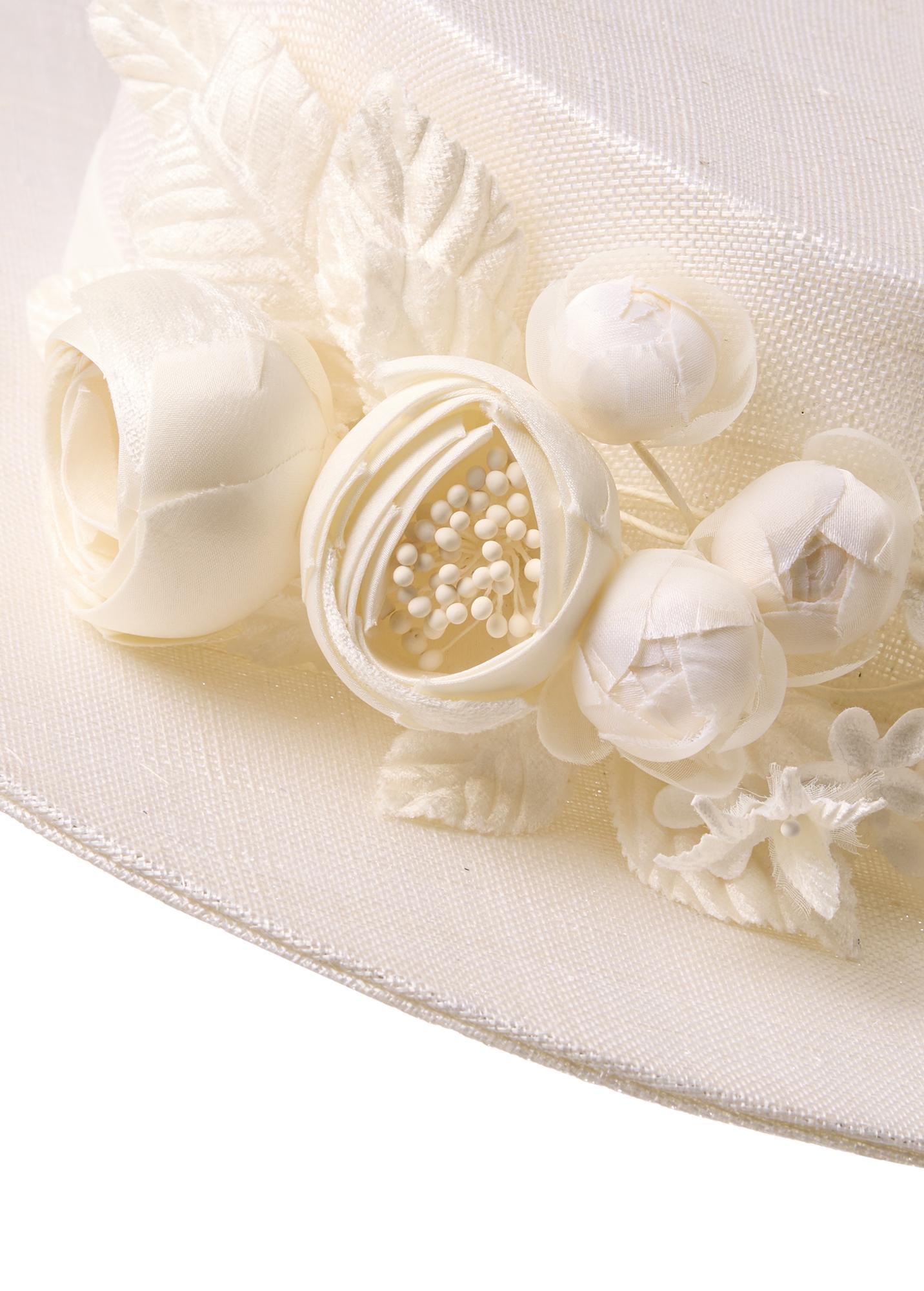 The Jennifer boater hat in ivory straw is the epitome of understated elegance. Crafted in a classic boater silhouette, it is beautifully adorned with delicate floral appliqué, adding soft texture and a romantic finish to this refined design.