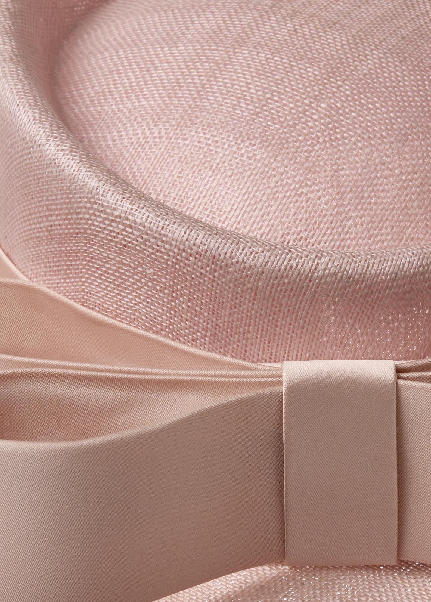 The Donna hat in blush pink straw is the epitome of classic elegance. Designed with a wide brim and a teardrop-style crown, this beautifully balanced silhouette offers both sophistication and soft femininity. A silk band wraps delicately around the crown, finished with a tailored silk bow that adds a refined, couture-inspired touch.