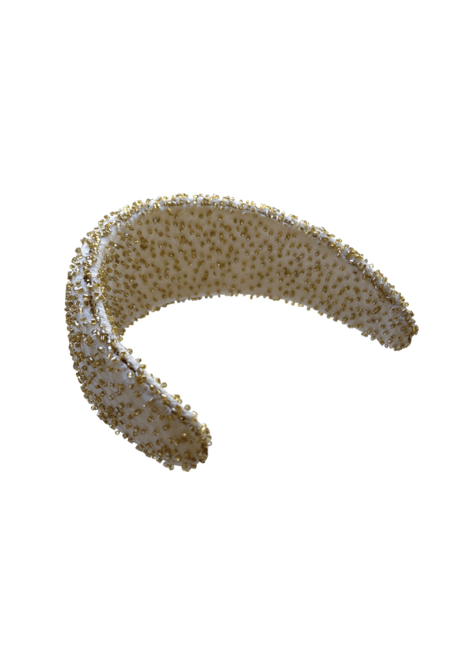 Add the Hyde headpiece to your look for a touch of evening glamour. Crafted in delicate silk chiffon, this headpiece’s golden glass beads capture the light in every instance.